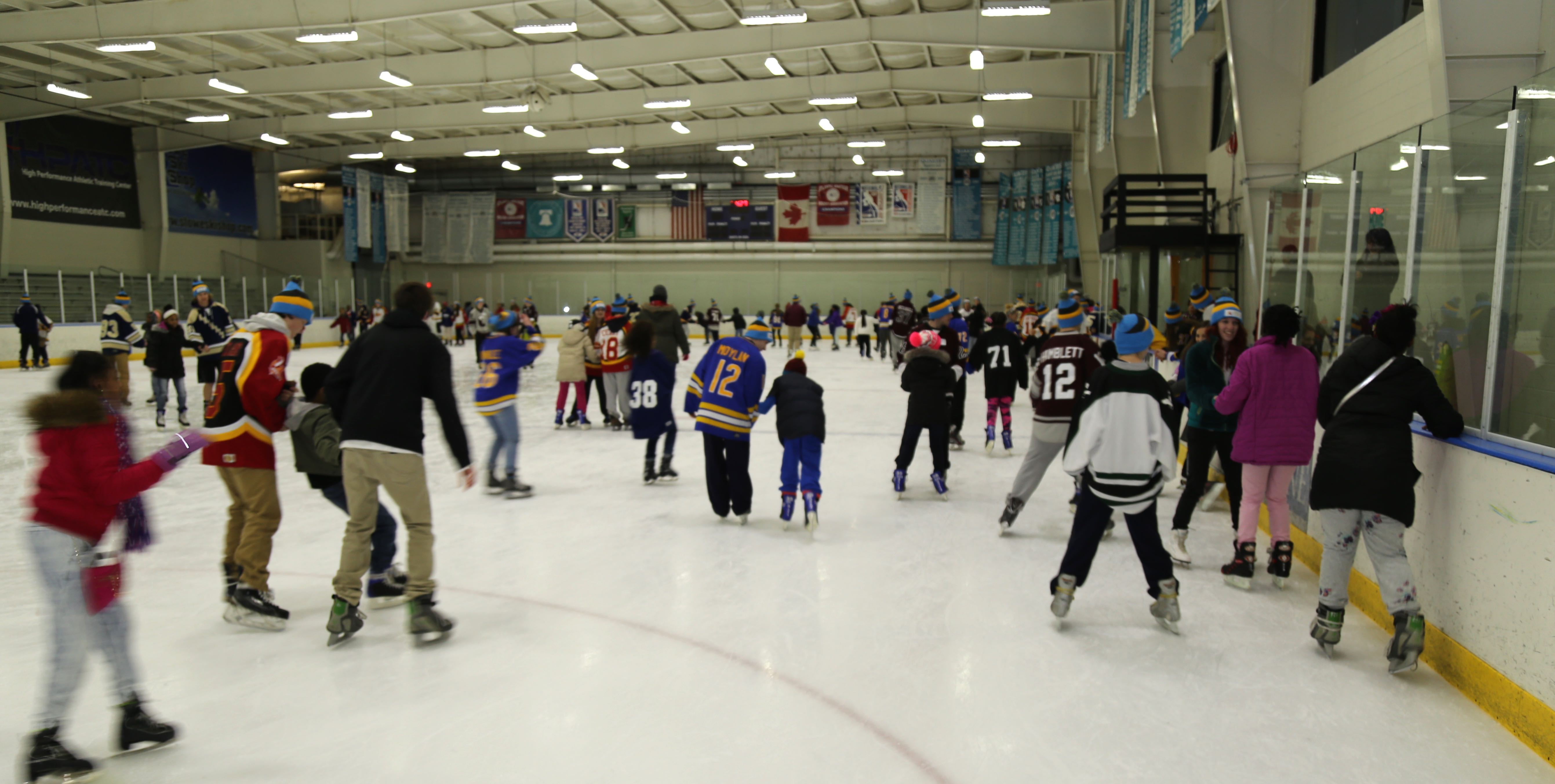 The high school students were warm and welcoming and took their partner to get their skates. Some even brought one of their old jerseys to give to their Chester friend to keep! Of course, the Chester kids put them on immediately and skated all afternoon advertising different high schools, colleges, hockey camps or hockey tournaments! The children exchanged their sneakers for either hockey skates or figure skates and then their high school friend sat them down and laced up their boots. The pair headed to the ice with a bit of trepidation, but really enthusiastic, often holding hands or just holding on to each other. Most of the Chester children had never been at an ice skating rink before and were attempting to skate for the very first time.