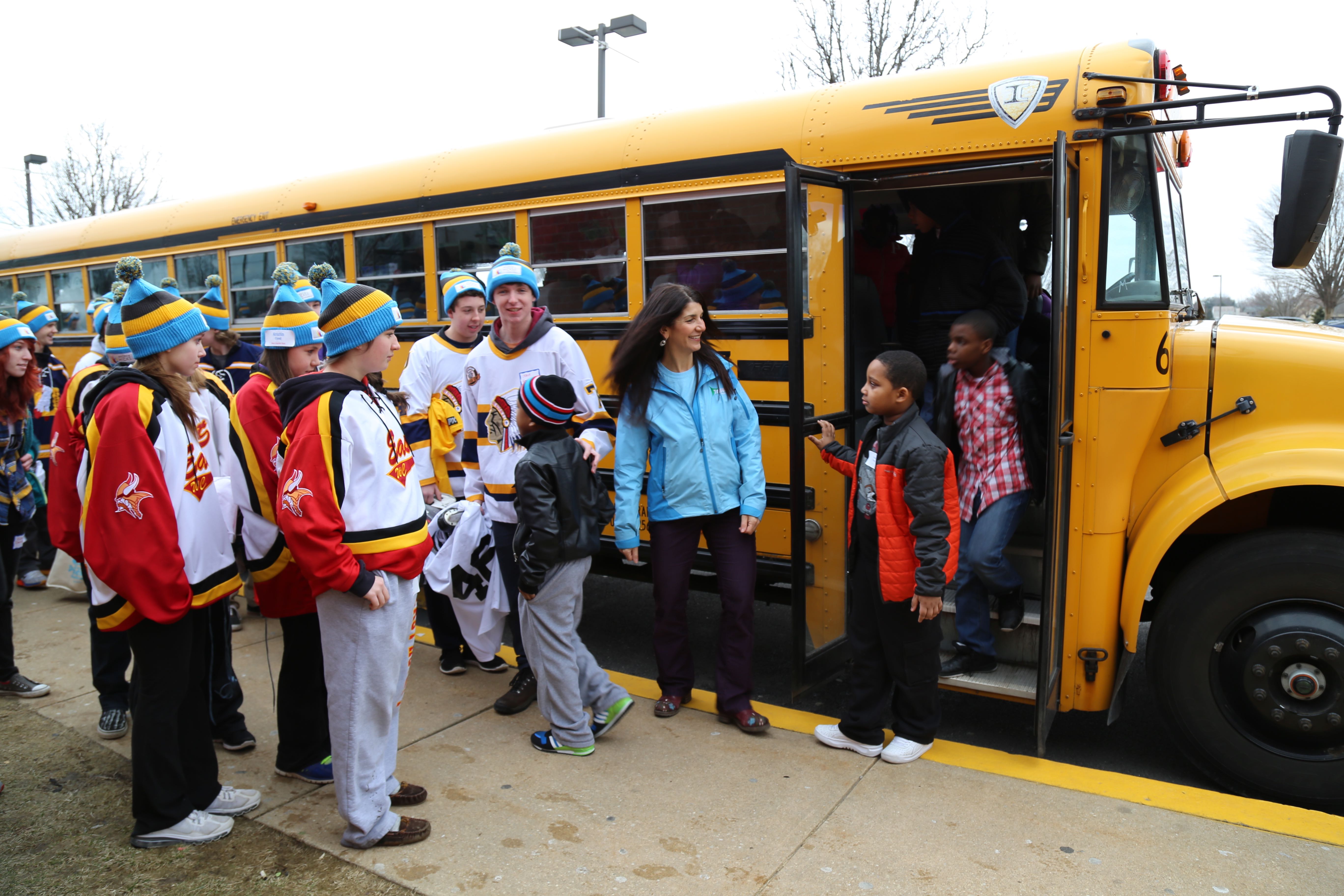 Instead of wearing the traditional sky blue Foundation STAFF shirts, the kids wore their school’s ice hockey jersey. Therefore, in order to show that they were volunteering with the Andrew L. Hicks, Jr. Foundation, each skater donned really colorful Foundation ski hats. Eighty five Chester children in grades 305 were bused to Ice Line and upon arrival, they were matched up one-to-one with the hockey player for the afternoon. Children exited the bus with great big smiles on their faces, excited about the opportunity to learn how to ice skate.