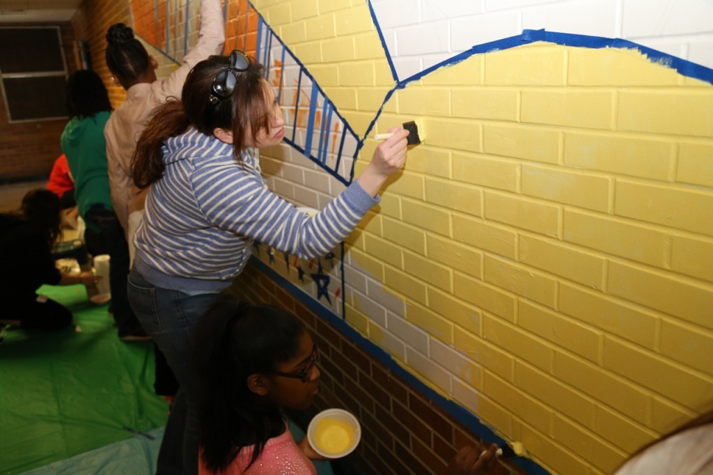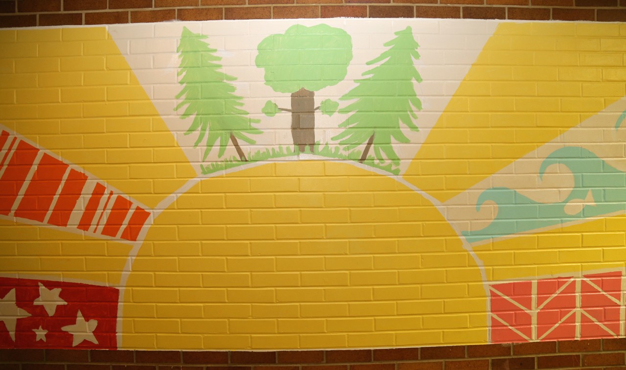 Our two most gorgeous projects were murals that were painted by the kids as a gift to the children of Toby Farms. Two Henderson High School seniors, Sophie Burgess and Carly McFadden designed a 20′ x 5′ mural and invited both Henderson and Chester students to paint the mural. Sophie and Carly laid it out and taped the design to the wall, and then the kids grabbed paint brushes and paint and went to work, and it turned out to be a gorgeous mural of bright colors and creative design. Thanks Sophie and Carly!