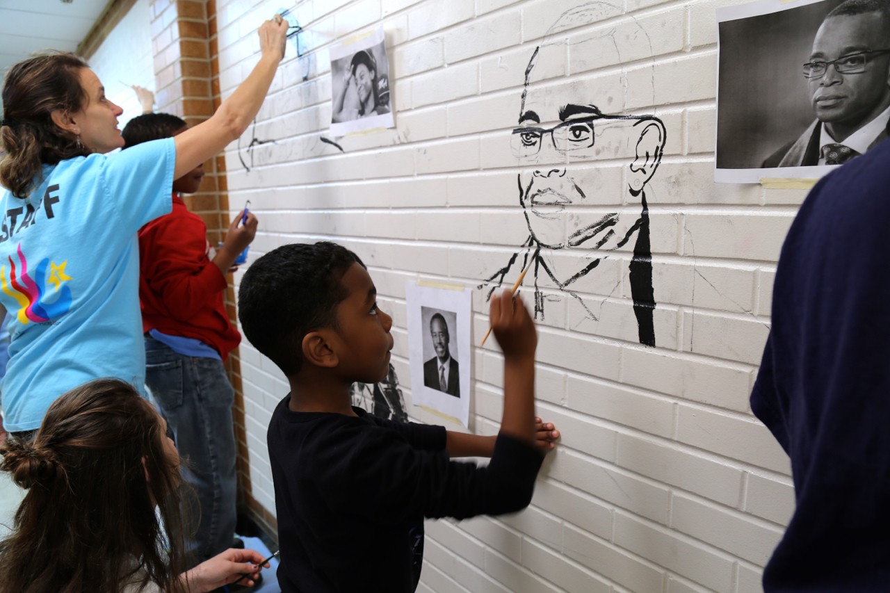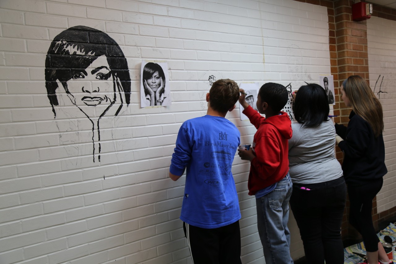 Finally, the masterpiece of the day was a black and white mural of current day, Black American role models. This 20′ x 6′ mural was designed and sketched by artist Steve Mogck, but mostly painted by Chester 5th and 6th grade students who are in the Warrior Guides program, their Henderson high school Guides and a few Chester RISE students. Each person represented on the mural has one of their quotes written out beside their picture. The hope of the Andrew L. Hicks, Jr. Foundation is that the images and wisdom of these model citizens will inspire Toby Farms Intermediate School students for years to come and remind them of their importance, potential and value. We hope they will always know that the West Chester community loves and cares about them.
