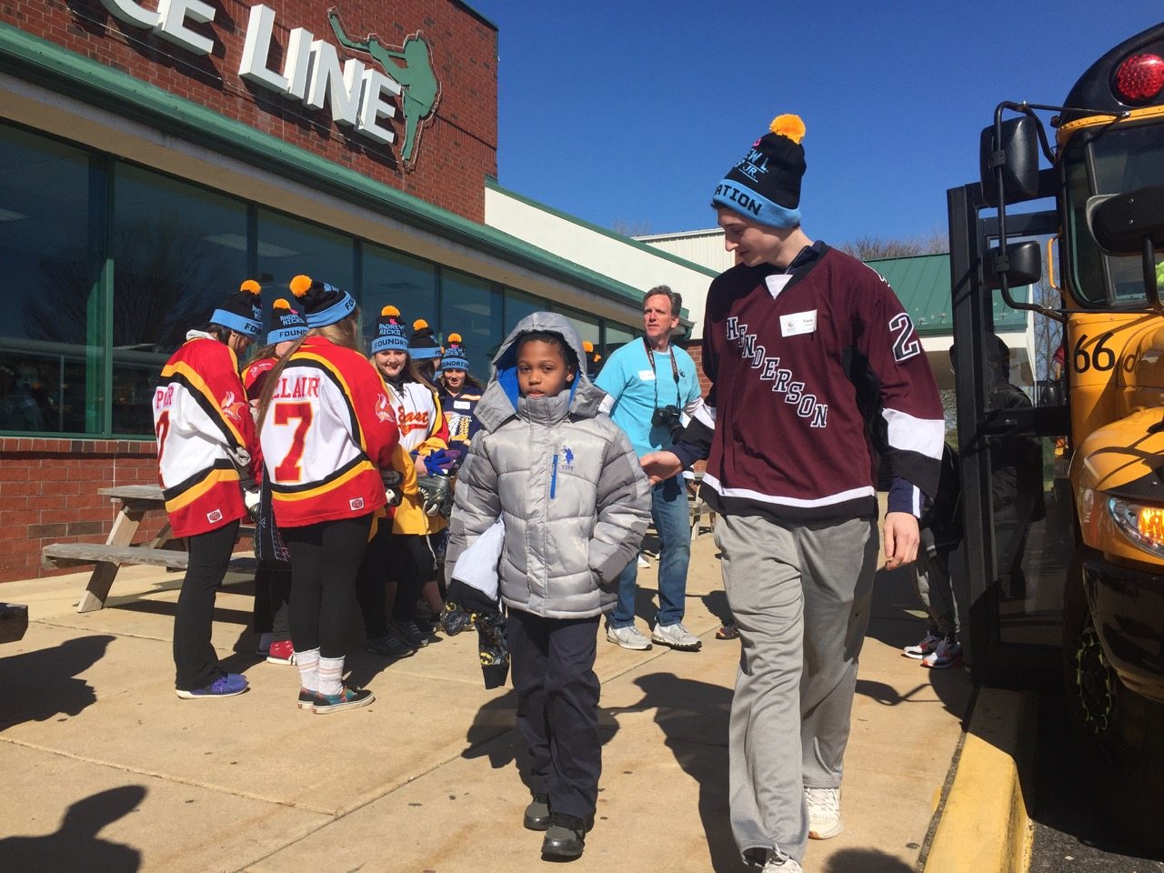 As the buses from Chester arrived, the 3rd through 5th graders piled off and were paired up with their very own hockey player for one-on-one ice skating lessons. It was great to watch the faces of the Chester skaters change from uncertainty to pure joy as they learned to skate throughout the afternoon. Some kids though, have been coming to this event for a couple of years so they didn’t look nervous at all – they were excited to skate again! Miraculously, a few children were actually paired with the same hockey player as last year!