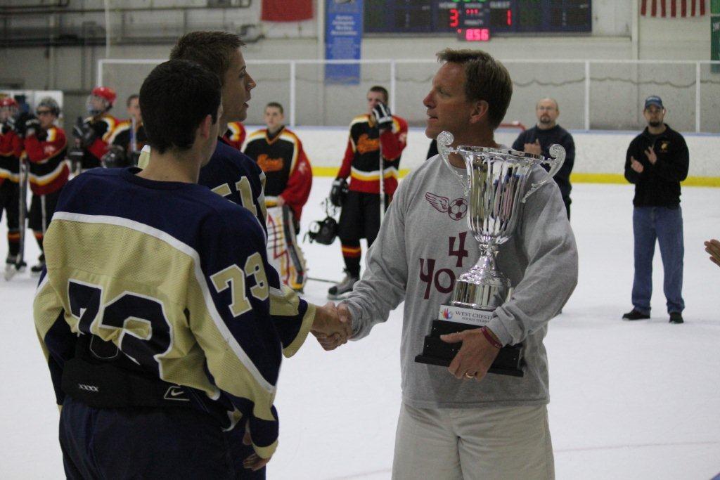 For the past three years, four neighboring high school ice hockey programs have competed in a pre-season tournament at Ice Line, in West Chester: Henderson, WC East, Rustin and Conestoga. Andrew played in the first two friendly tourneys where Henderson skated away with the championship both years. This year the Andrew L. Hicks, Jr. Foundation purchased a beautiful silver cup trophy to present to the winner of this tournament each year. The tournament is now officially called the West Chester Cup Tournament. The trophy has space to inscribe the winning school’s name and year on a small plaque on the trophy. The 2010 winner was Bayard Rustin High School.