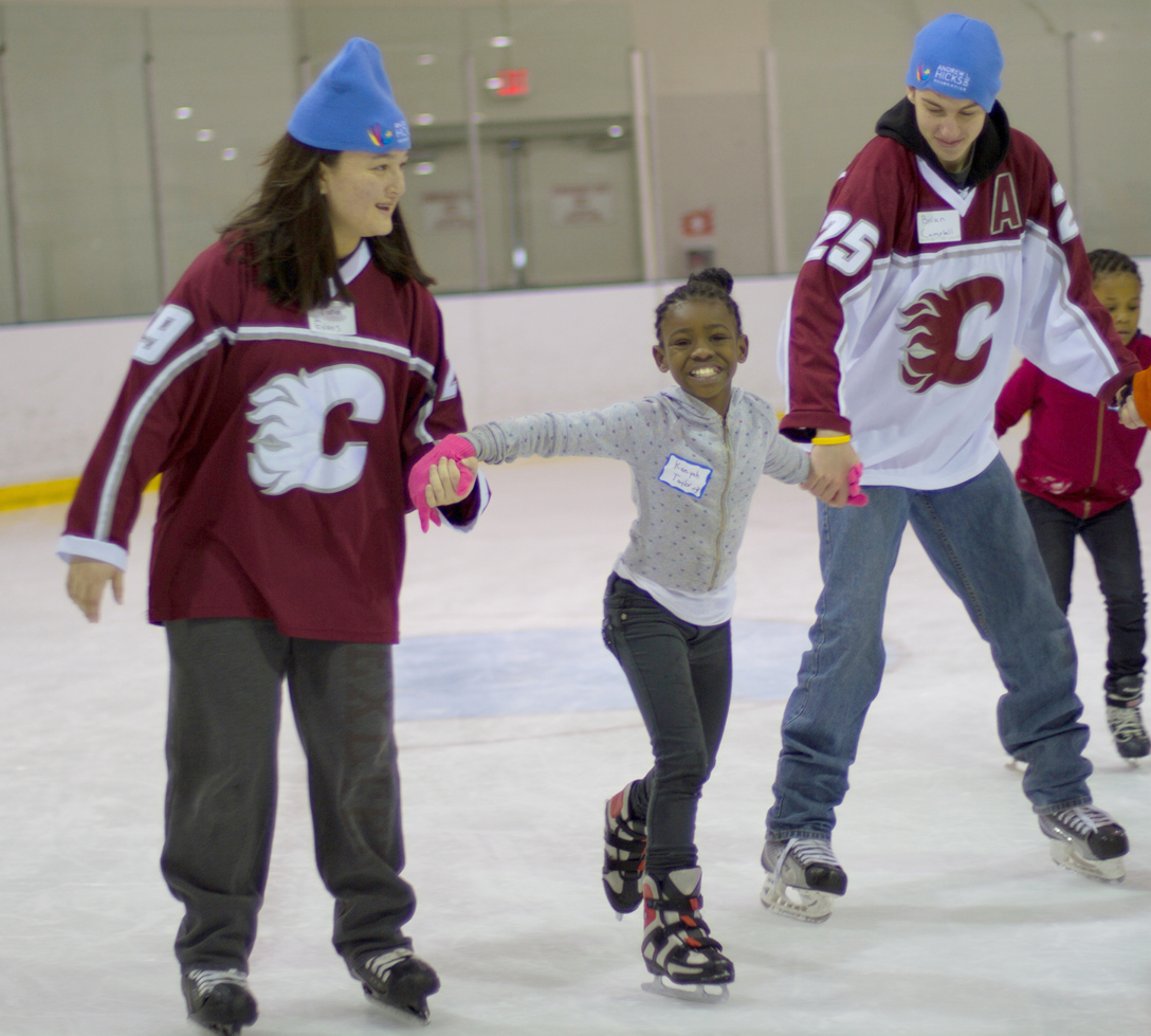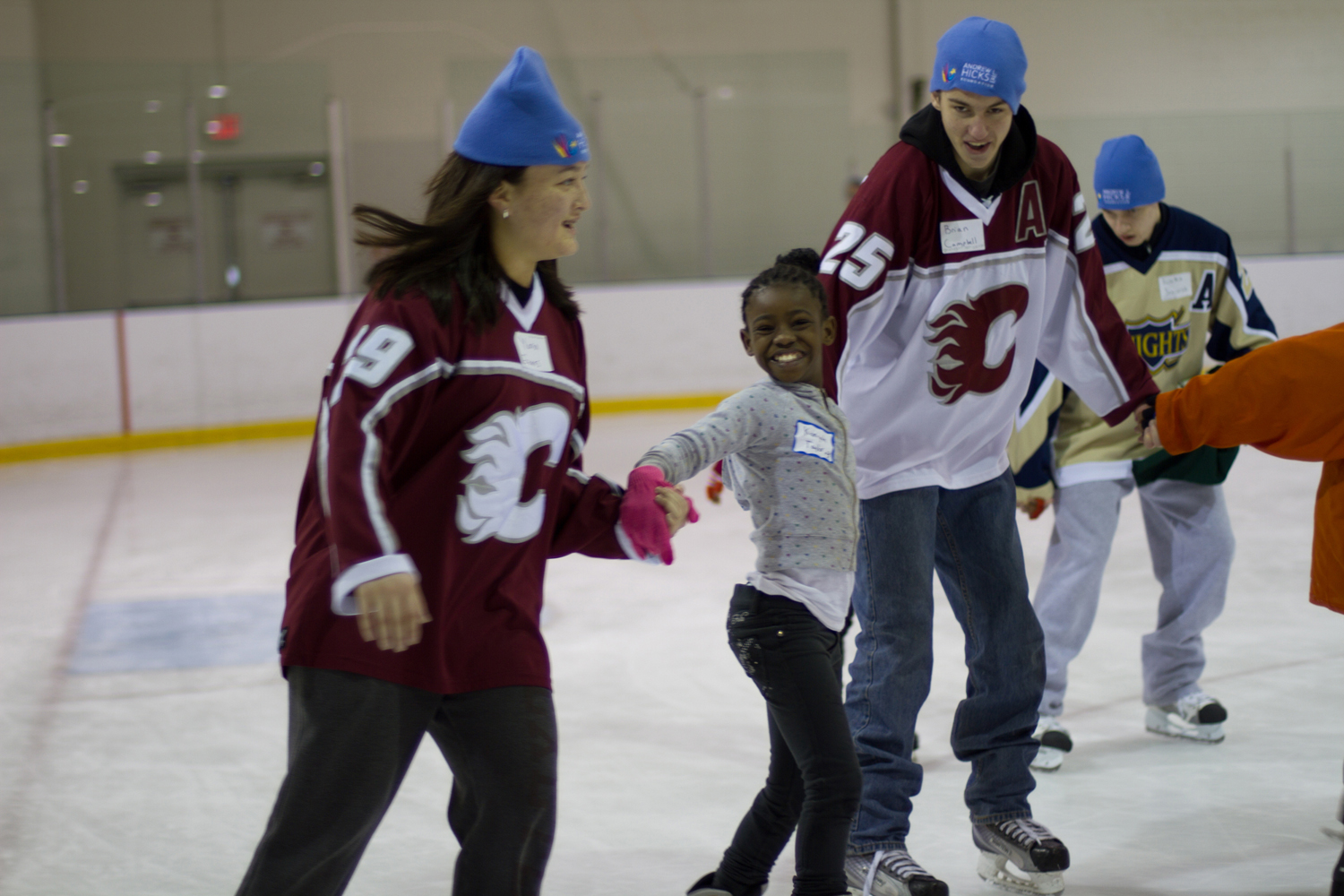 68 high school skaters met their Chester buddy at the door, quickly got acquainted and then got them fitted for skates. Each Chester child was then gifted with a jersey from their buddy. Most jerseys belonged to the hockey players and were theirs back in the day when they first learned to skate! The Chester children were ecstatic as they quickly donned their new jersey right on top of their winter coat! Then the pair took to the ice and the hockey players began to instruct and encourage the kids. Some even took a minute to build their trust; proving they knew what they were doing by taking a few quick laps forward and backwards! The skaters stayed on the ice until lunch was served and then jumped back on for some more skating. In the end, everyone enjoyed brownies and cake together before taking the skates off. It was a great day, sometimes building on friendships that were established at previous Andrew L. Hicks, Jr. Foundation events, and sometimes beginning a new bond.