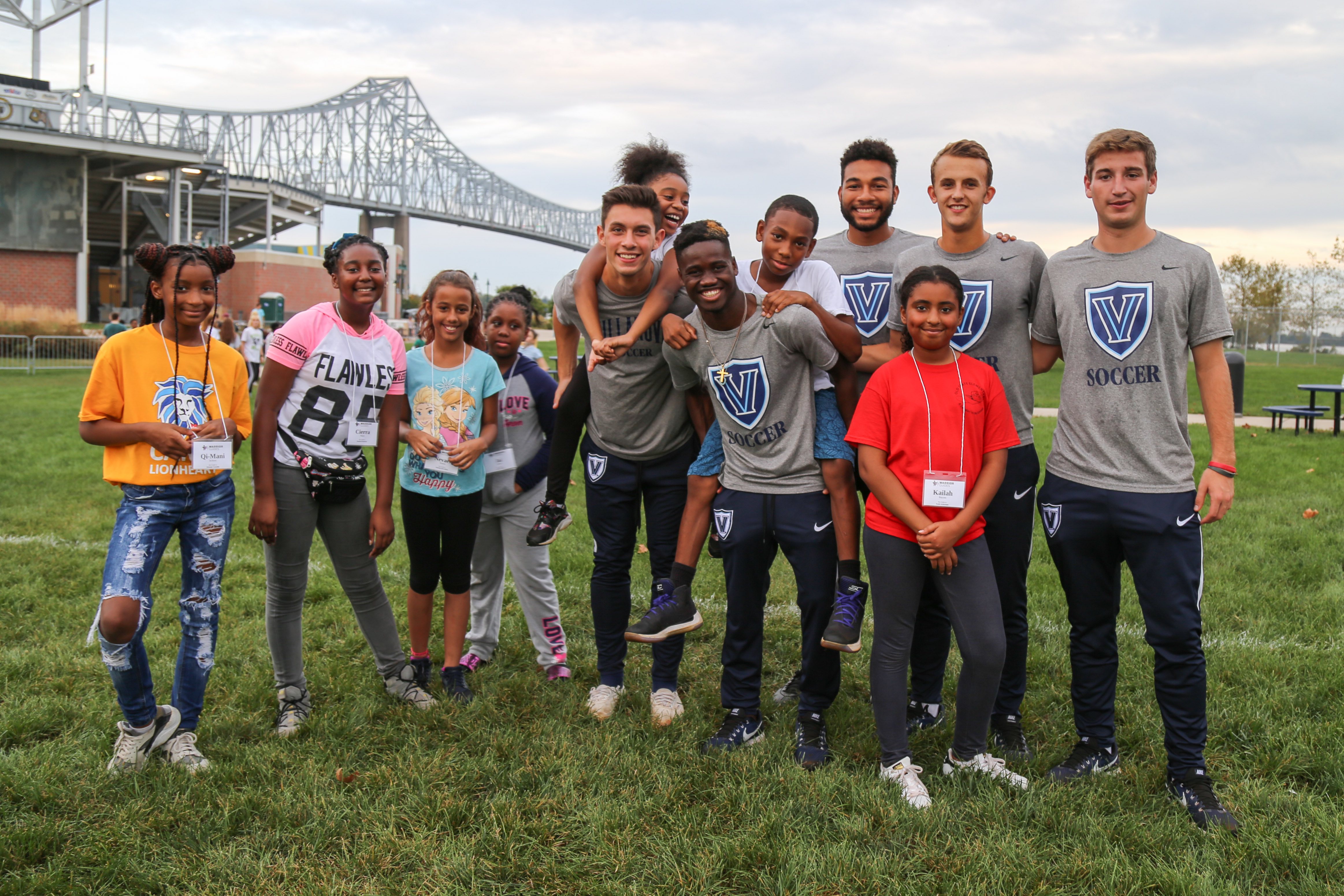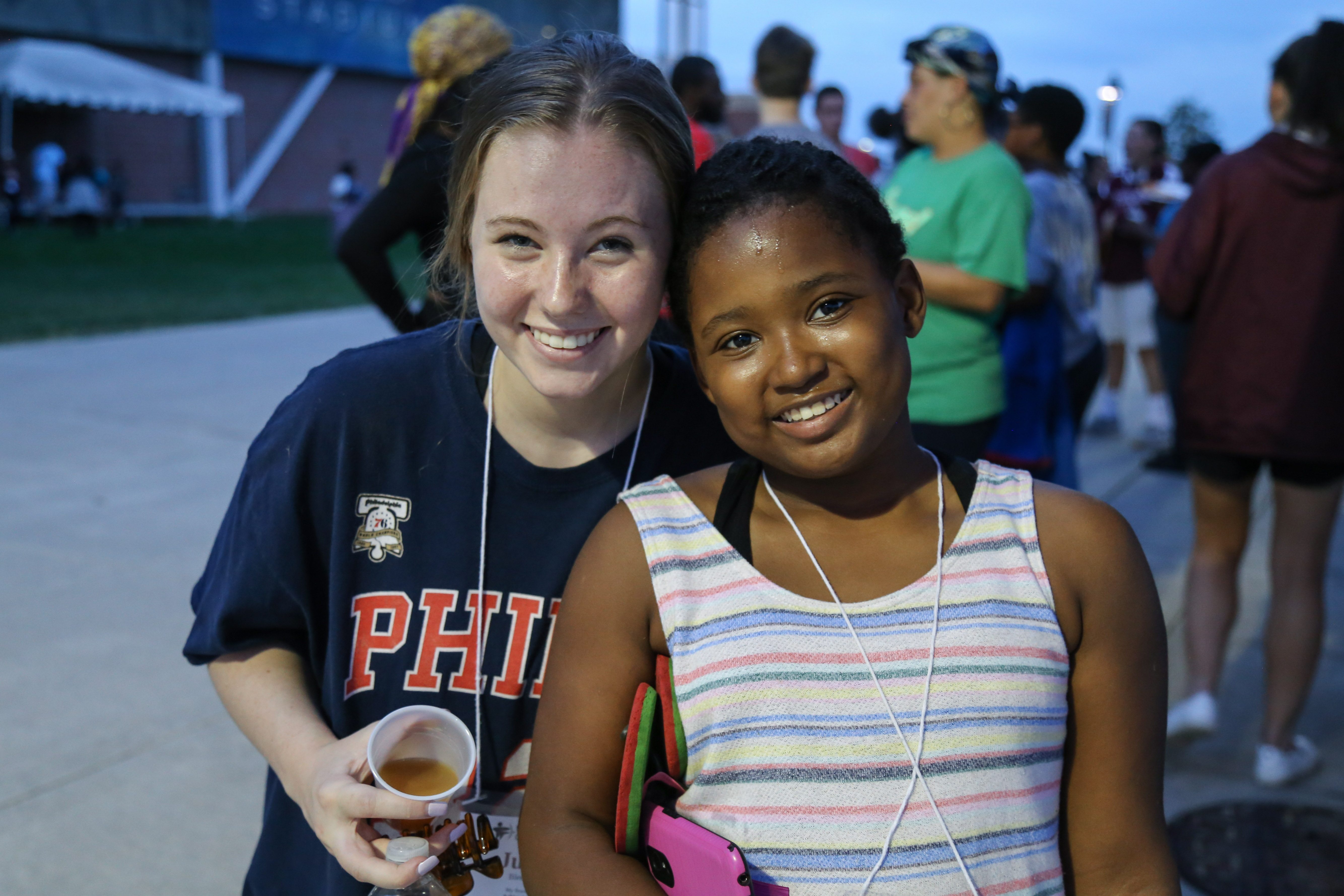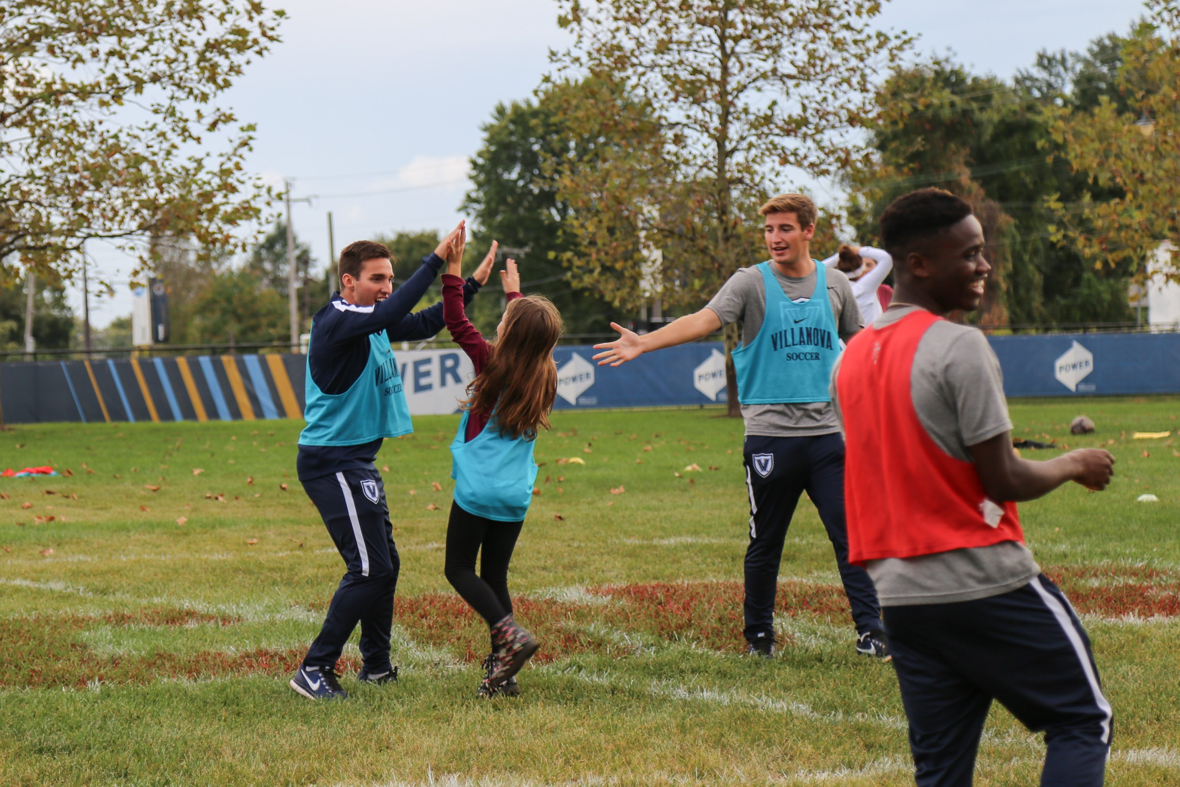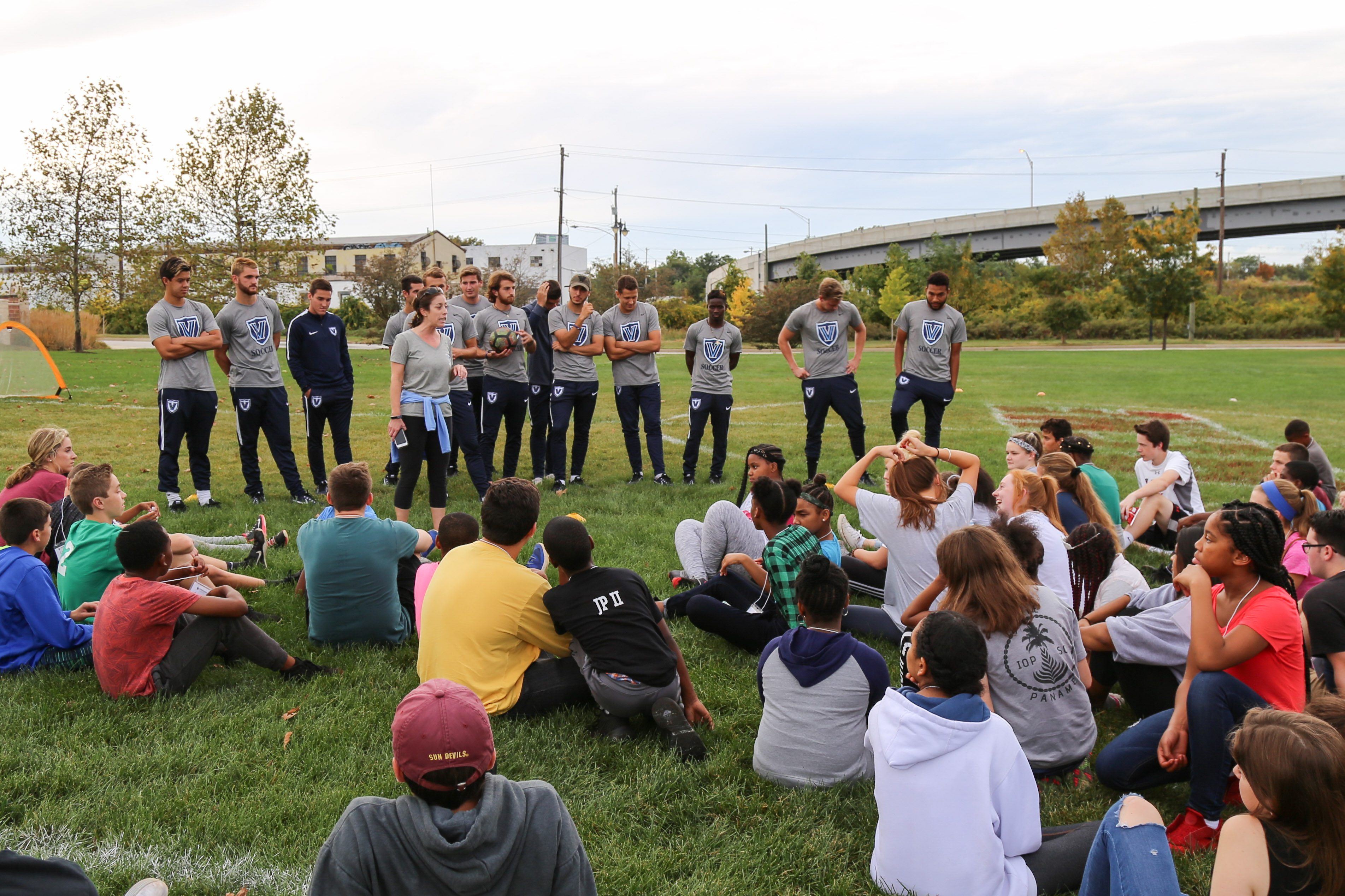 After a great tour, the pairs got to enjoy dinner on the plaza outside the stadium. Dinner consisted of pizza, chips, apples, and water. As everyone got to know each other the Villanova Soccer Team came by to play some soccer with everyone! Richie Schlentz, a current member on the team, was a former Warrior Guide himself, and encouraged his team to come volunteer their time with us and it looked like everyone had a blast! While some groups were playing soccer – others were doing team building and ice breaker activities to get to know one another.