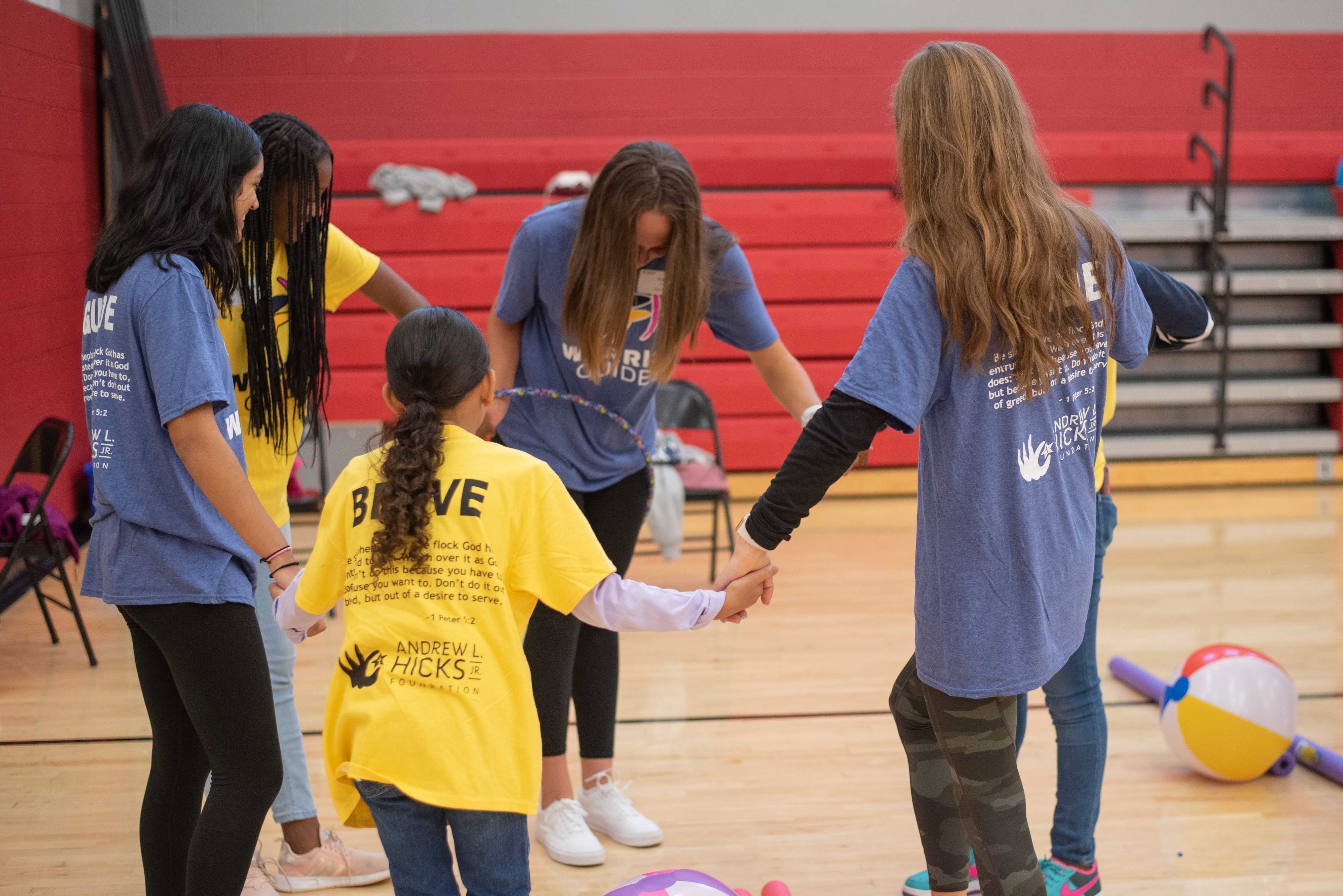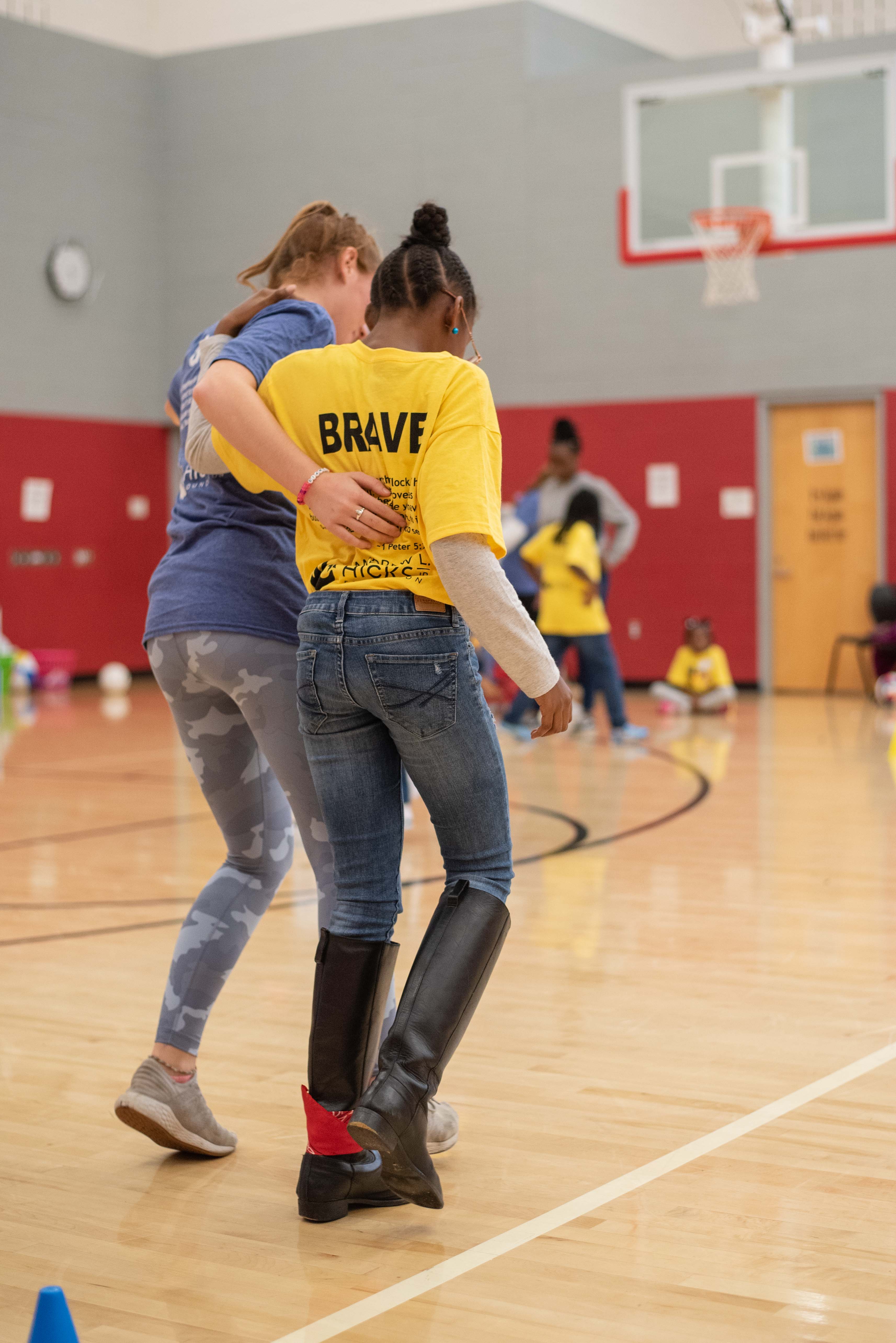 Another fun activity of the day included an inflatable obstacle course outside. The pairs competed against one another while racing through the bounce course. There were lots of laughs and excitement. Following these adventurous games and competitions, the pairs slowed things down and enjoyed a tasty dinner of pizza and salad. Durning dinner the Guides and Braves participated in some more one-on-one question and answer activities. The pairs sat together and learned more about each other.